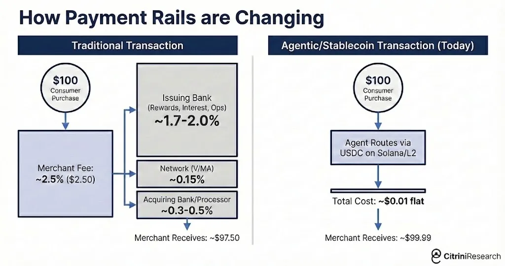 比价和聚合能做的事情终归有限。对用户而言,最大的反复省钱方式(尤其是当智能体开始彼此交易之后)是消除手续费。在机器对机器的商业交易中,2-3%的信用卡刷卡手续费,成了明显的目标。