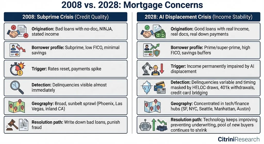 这是一个没有天然刹车的负反馈循环。人类智能替代螺旋。白领们的收入能力(以及理性驱动的消费)遭到结构性损害。他们的收入,是 13 万亿美元抵押贷款市场的基石——这迫使承保商重新审视:优质抵押贷款还算优质资产吗?