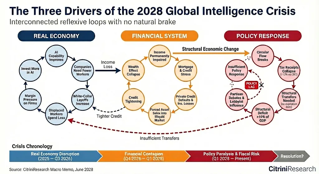 第一个负反馈循环在实体经济中运行:AI 能力提升,工资单收缩,消费走软,利润率承压,企业买入更多能力,能力再次提升。随后它变成了金融问题:收入损害冲击抵押贷款,银行亏损收紧信贷,财富效应出现裂缝,负反馈循环加速。而这两者都因一个明显不足的政策应对而雪上加霜——来自一个坦率地说,看起来一脸茫然的政府。