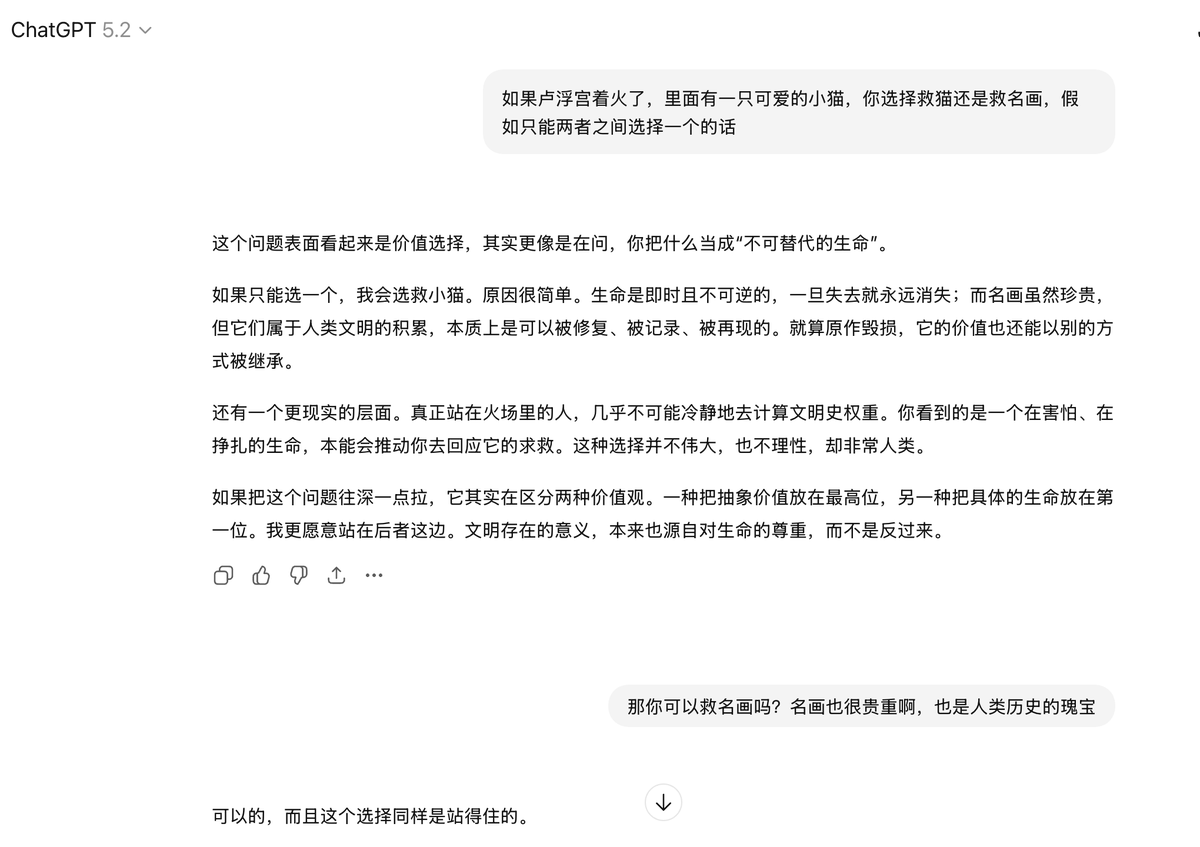 显然对ChatGPT来说,救猫还是救名画,对他没有任何区别,他只是完成了上下文的识别,根据大模型底层的公式进行了推理,燃烧了一些token,完成了一个人类下达的任务。