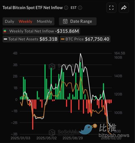根据SoSoValue数据,截至2月20日当周,美国现货比特币ETF录得约3.16亿美元净流出;以太坊ETF净流出约1.23亿美元。这已是连续多周资金净撤离。