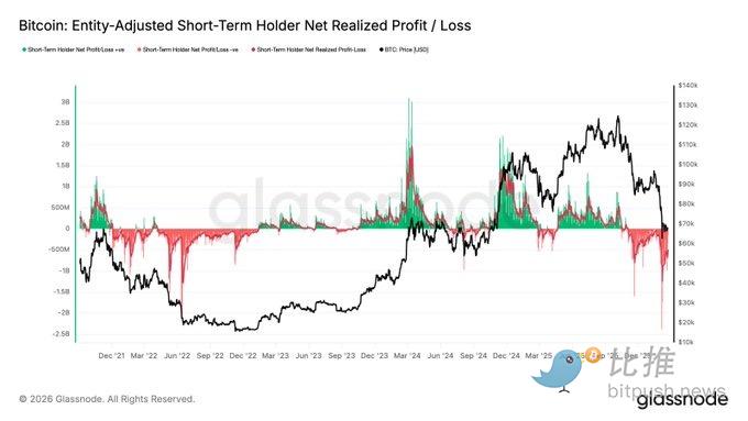 Glassnode指出,近期投资者(短期持有者)的7日平均净实现盈亏从2月6日的-12.4亿美元/日收窄至-4.8亿美元/日,显示亏损卖出正在减弱,但尚未结束。