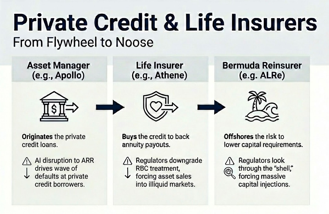 损失冲击了为了对抗长期负债而持有非流动性资产的资产负债表。本应使系统具有弹性的“永久资本”并非某种抽象的、有耐心的机构资金和承担复杂风险的成熟投资者。它是美国家庭、“普通大众(Main Street)”的储蓄,结构化为年金,投资于同样目前正在违约的、受 PE 支持的软件和技术票据。那些无法抽逃的锁定资本是人寿保险投保人的钱,而在那个领域,规则有点不同。