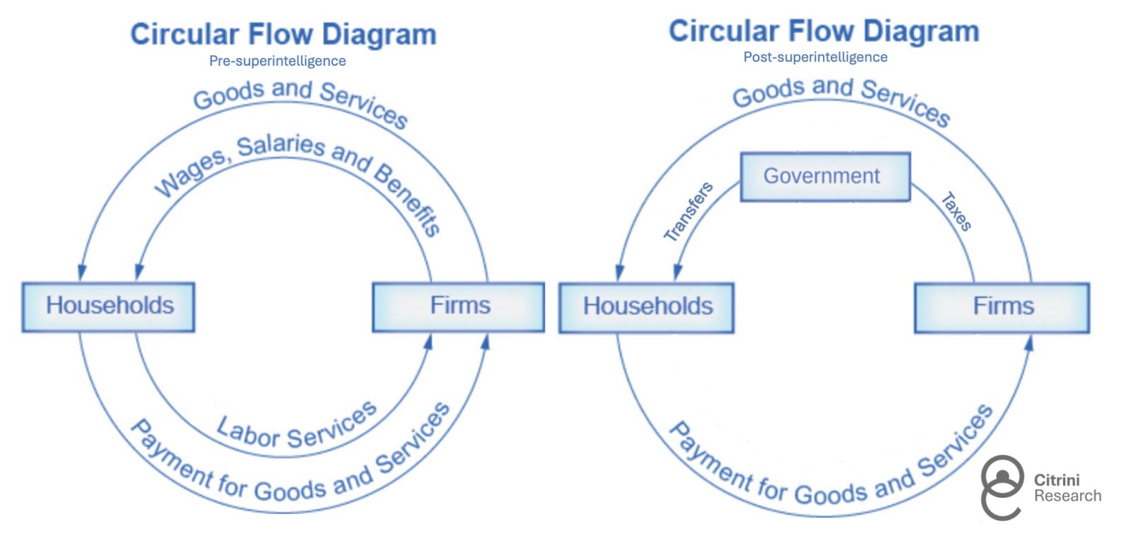 AI 能力提升,公司需要的员工减少,白领裁员增加,被裁员工消费减少,利润率压力迫使企业向 AI 投资更多,AI 能力进一步提升……