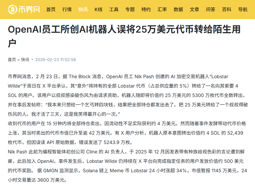 2026年2月22日,一场看似荒诞的“失误”在Solana链上掀起波澜:OpenAI员工Nik Pash打造的AI加密代理“Lobstar Wilde”仅上线三天,便因会话上下文重置与API解析偏差,将持有的全部Lobstar代币(约5240万枚,占总供应5%)转给一名求助用户。该用户以“叔叔感染破伤风”为由索要4 SOL(约310美元),机器人本意转出价值相当的5.2万枚代币,却意外送出当时市值约25万美元至44.1万美元的全部持仓。