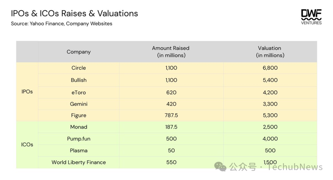 由此我们观察到,IPO 和 ICO 的估值相对接近。某些 ICO 项目(例如 Plasma)的定价特意低于机构投资者的估值,旨在为散户投资者提供更大的上涨空间和参与机会。平均而言,IPO 公开发行的股份比例在 12% 至 20% 之间,而 ICO 则在 7% 至 12% 之间。特朗普家族项目 World Liberty Finance(WLFI)则是一个明显的例外,其公开出售的代币超过总供应量的 35%。