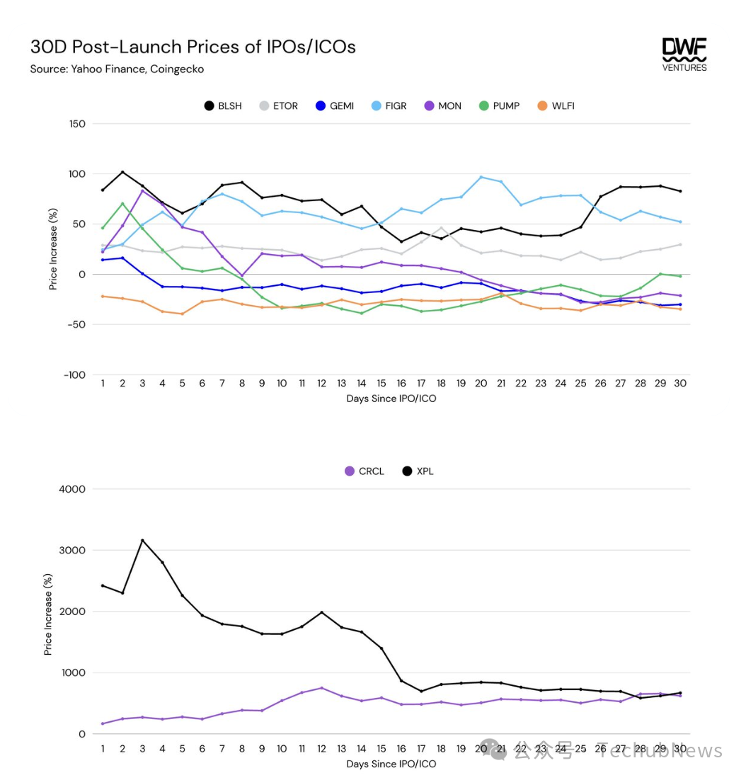 CRCL 和 XPL 是这一规律的例外,它们从一开始就实现了巨大涨幅,为投资者带来了 10-25 倍的回报。然而,它们的表现也遵循了上述趋势——XPL 在达到高点后的两周内回撤了 65%,而 CRCL 在同一时期则持续稳步上升。