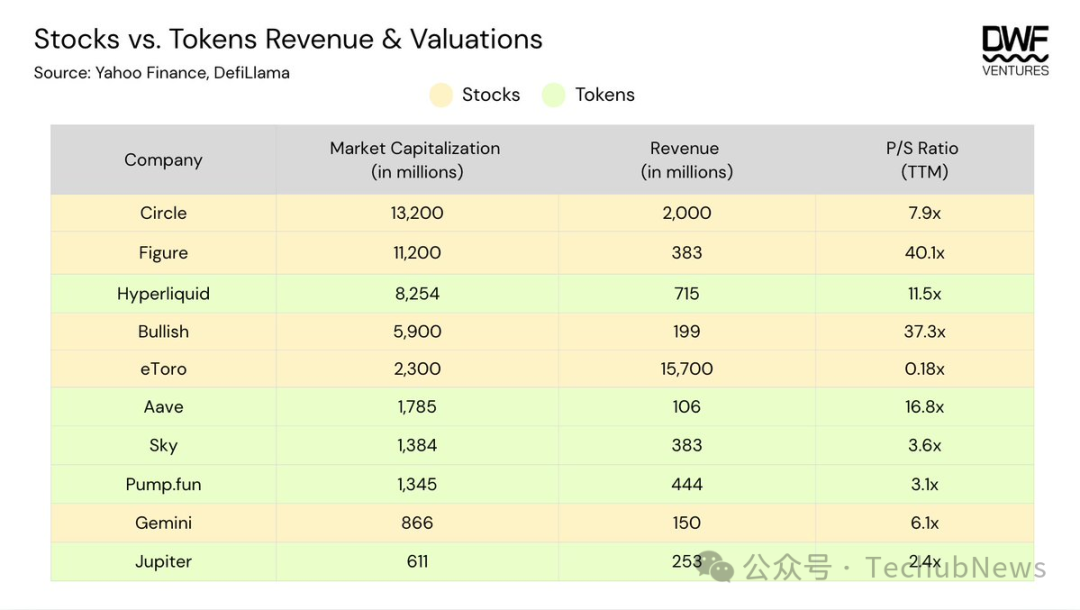 例如,Figure 推出了面向散户和机构投资者的 RWA 借贷池,并且是首个获得美国证券交易委员会(SEC)批准发行收益型稳定币(YLDS)的公司。Bullish 是一家受监管的交易所,旗下还拥有 CoinDesk 等其他业务,这使其价值超越了单纯的交易服务。所有这些因素都可能导致其溢价较高。