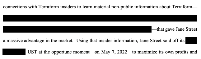 据法庭披露的大量删节诉状显示,Jane Street通过与“Terraform内部人员建立纽带,获取重大非公开信息”,并利用这些信息出售与Terra区块链挂钩的代币,从而进一步加剧了崩盘。