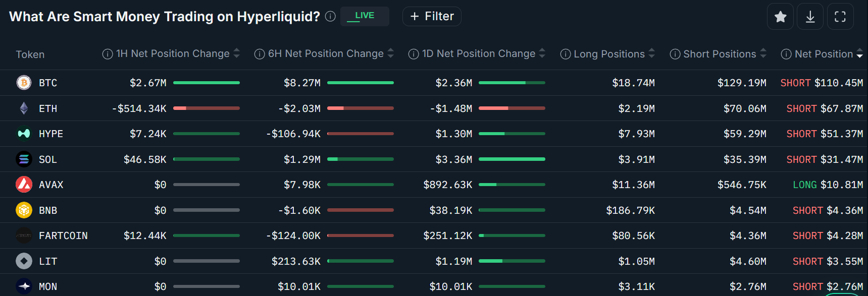 聪明钱交易者、主流交易代币及在 Hyperliquid 交易所持仓分布。来源:Nansen