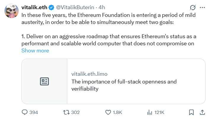 面对市场的严冬,以太坊基金会(EF)的财务战略发生了防御性转向。Vitalik Buterin 宣布,基金会将进入为期五年的“温和紧缩”阶段。