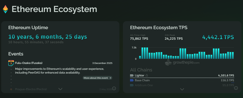 在价格承压的同时,以太坊的技术基本面却展现出了极强的韧性,甚至出现了“价量背离”的罕见现象。近期,以太坊网络的 TPS(每秒处理交易量)创下了 75,862 的历史新高,远超此前 58,786 的峰值。