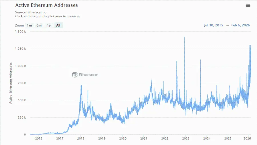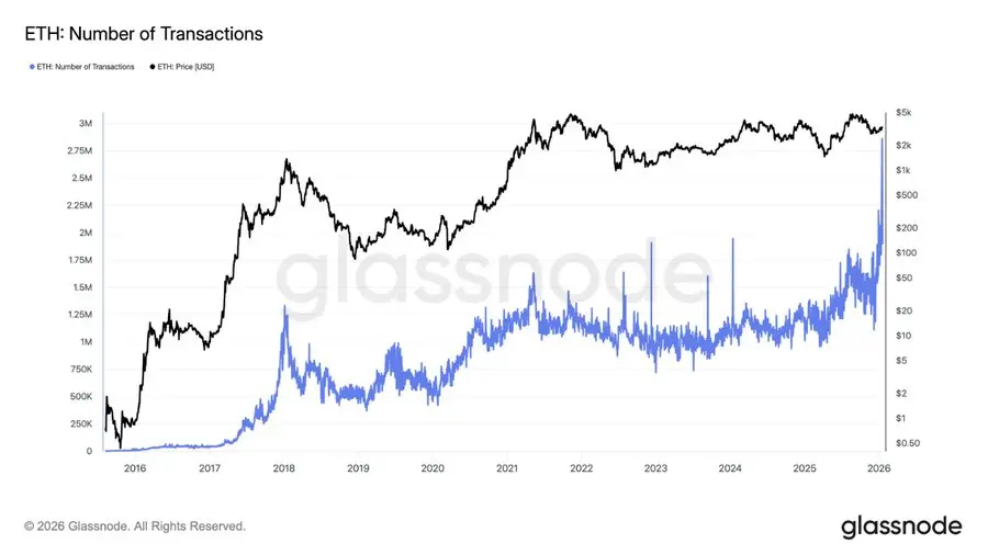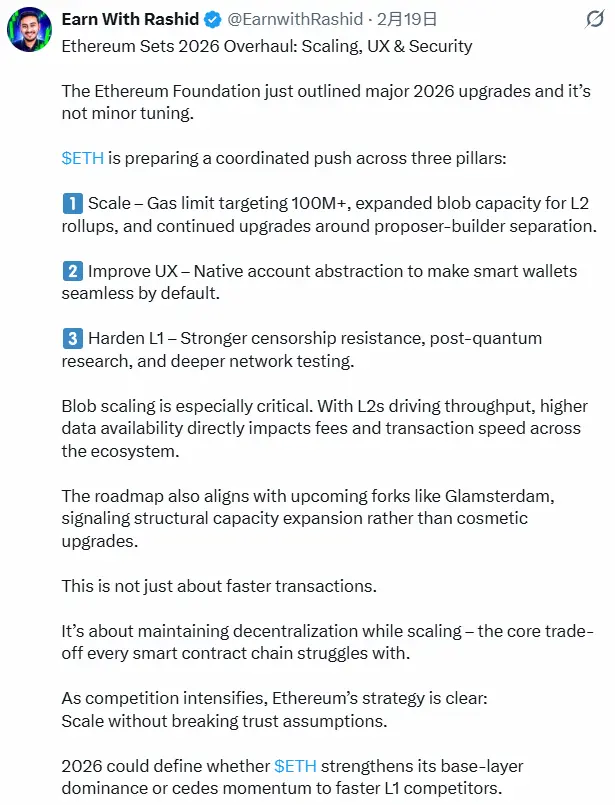 所以,结合质押锁定,有效流动供应大幅收紧(约45%+ ETH已illiquid), 尽管ETH价格短期承压,但网络基本面在2026年2月正处于爆发前夜