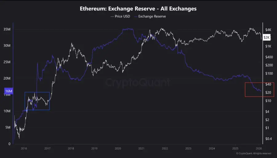 交易所ETH储备减少持续下降,全交易所ETH储备降至16.2M ETH(2016年以来最低),2026年初持续净流出。