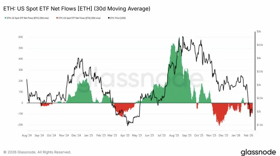 1月整体净流出2.53亿美元,但2月17日单日净流入4863万美元(BlackRock ETHA单日+2289万领跑),2月13日也曾翻正+1026万。