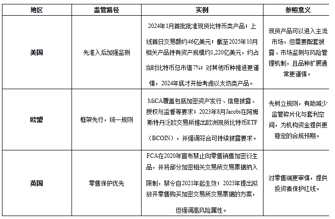 从全球经验看,美国、欧盟与英国分别代表了三种不同的加密现货ETF监管路径:美国让现货类产品进入主流市场,同时强化规则、披露、市场监测;欧盟强调框架先行,通过统一制度来降低监管套利空间;英国长期以零售保护为主,先限制高风险产品的可得性,再在更严格的推广与风险揭示条件下讨论边界调整。权衡三条路径的不同特点,日本未来或可采取介于开放与约束之间的中间路线:在引入合规产品的同时,强化披露、适当性管理与反欺诈要求,以提升可监管性与投资者保护水平。