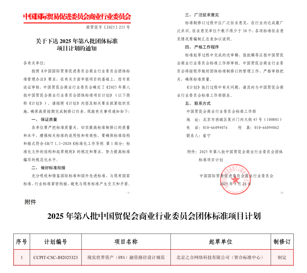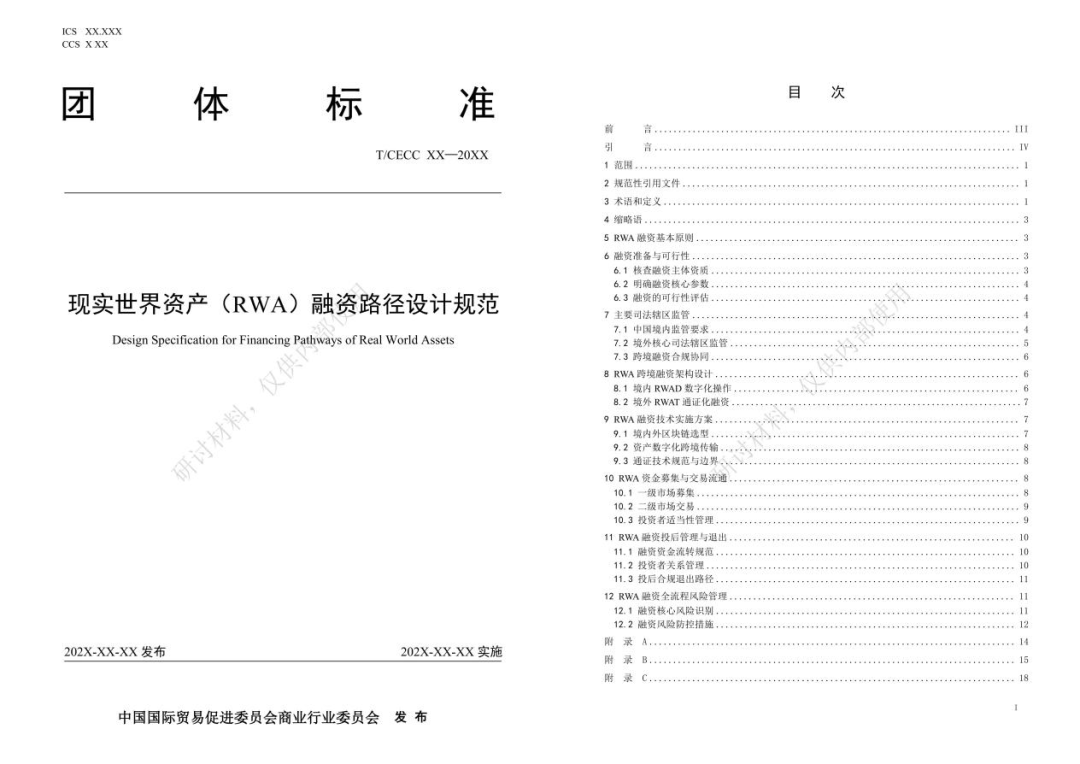 基于此,由中国贸促会商业行业委员会归口管理、智合标准中心组织起草的《现实世界资产(RWA)融资路径设计规范》团体标准(以下称《标准》)应运而生。《标准》旨在构建“合规架构设计-高效技术实现-风险识别防控-市场创新驱动”于一体的实践方法论,为各类典型资产提供的融资路径设计方案,助力企业实现RWA项目从“资产上链”到“成功融资”。