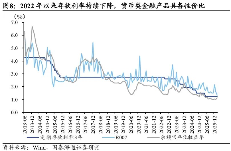 ✔驱动因素在于收益比价重构:一方面,存款利率多轮下调,实际回报吸引力下降,居民资产配置思路由专注存款转向“类存款”金融产品;另一方面,债券与权益市场修复,提升了相对收益优势。