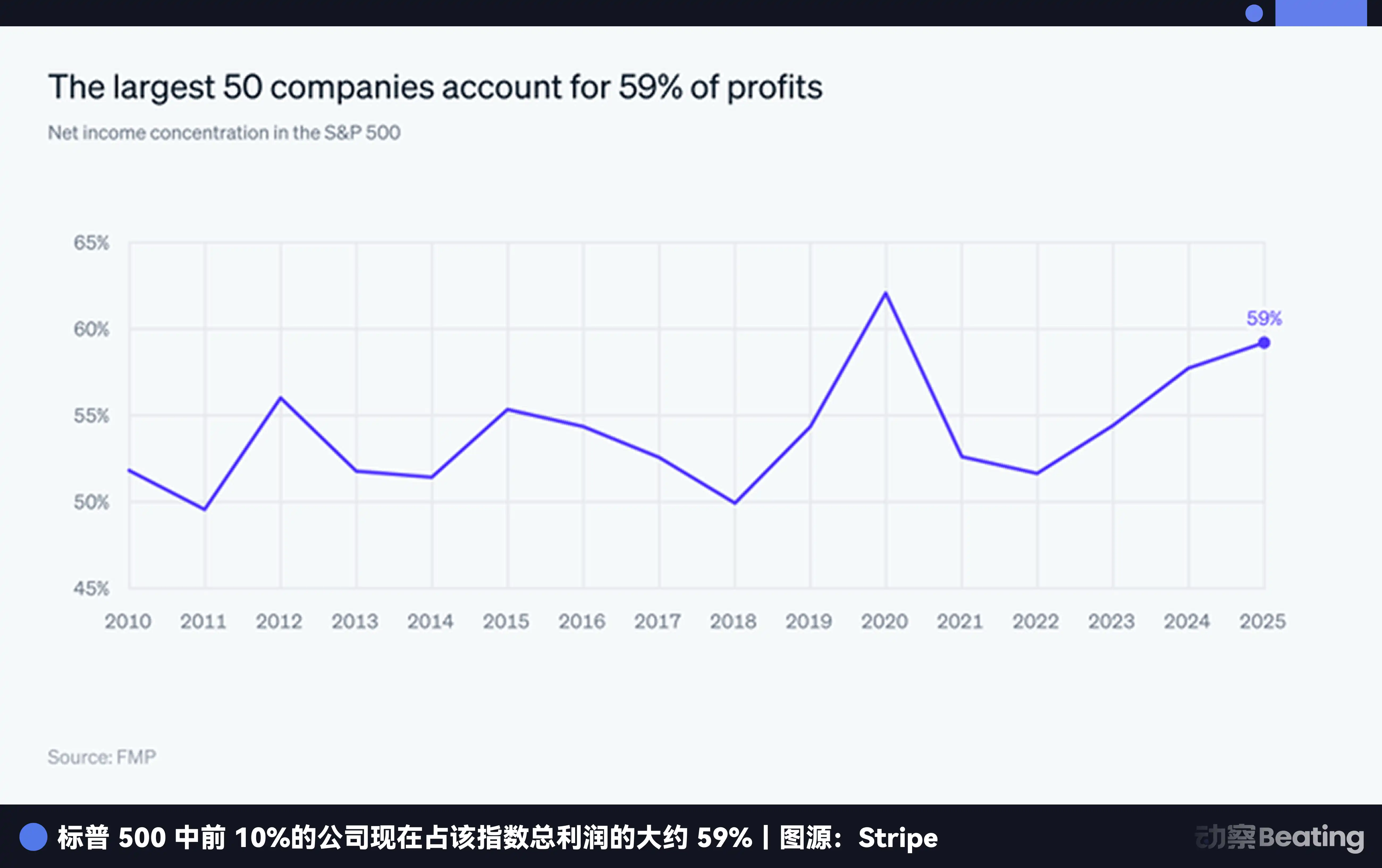 Stripe 在信中引用了一组数据:美国盈利能力最强的 1/3 上市公司,拿走了整个股市 2/3 的市值,这是自 1963 年有数据以来的最高比重。摩根大通在 2026 年初的展望中也讲述了赢家通吃的现状,指出市场过度集中的情况。标普 500 里 10% 的头部公司,贡献了 59% 的利润。