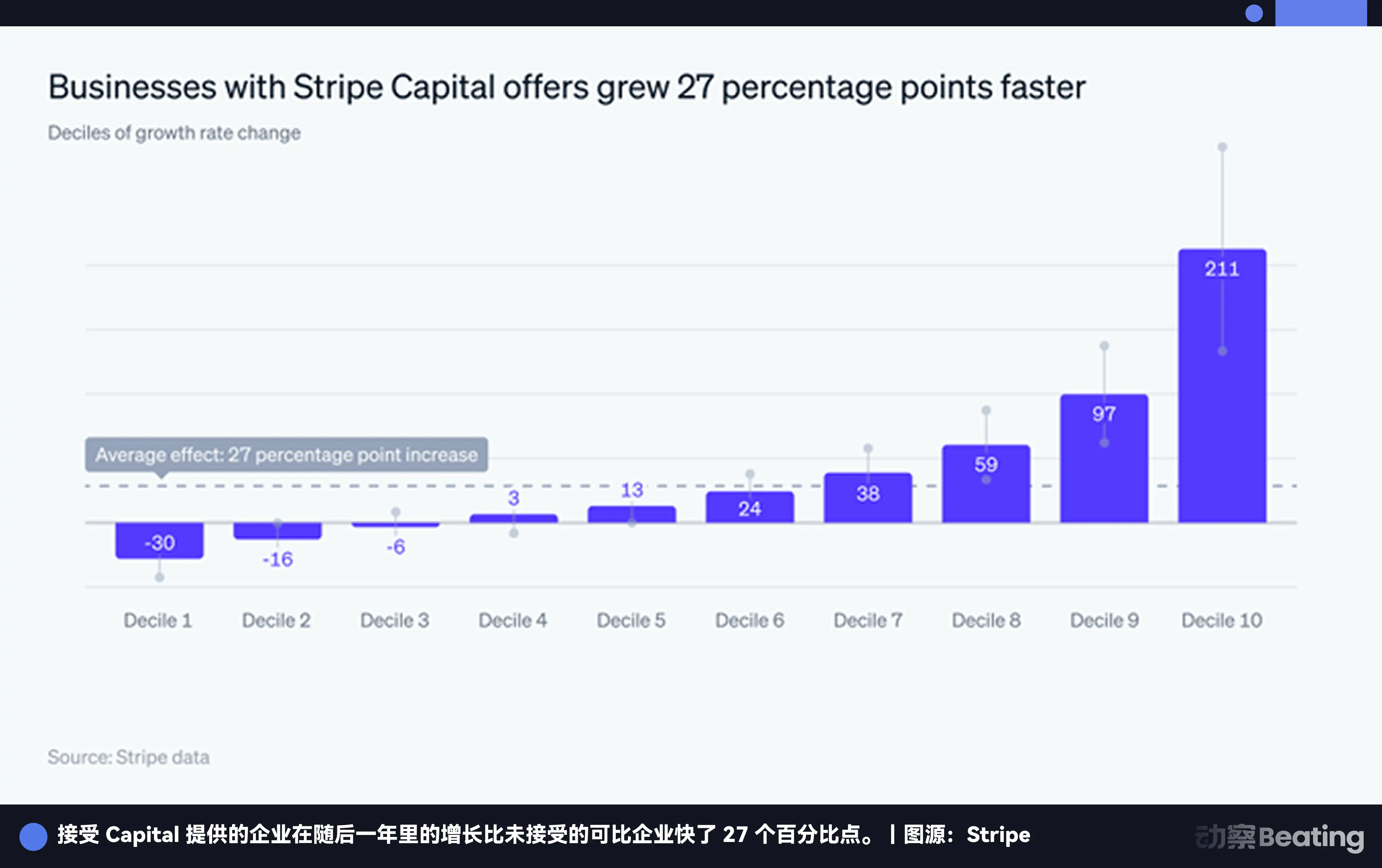 Stripe Capital 的逻辑是,我有你所有的交易数据,我比任何银行都更了解你的生意。它利用商户的实时交易数据放贷,绕开传统银行的繁琐审批流程。拿到 Stripe Capital 融资的企业,接下来一年的增长速度,比没拿到的同类企业快了 27 个百分点,最快的那一档甚至快了 3 倍以上。