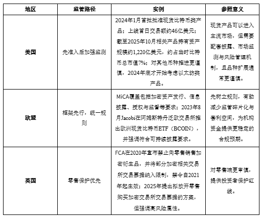 从全球经验看,美国、欧盟与英国分别代表了三种不同的加密现货ETF监管路径:美国让现货类产品进入主流市场,同时强化规则、披露、市场监测;欧盟强调框架先行,通过统一制度来降低监管套利空间;英国长期以零售保护为主,先限制高风险产品的可得性,再在更严格的推广与风险揭示条件下讨论边界调整。权衡三条路径的不同特点,日本未来或可采取介于开放与约束之间的中间路线:在引入合规产品的同时,强化披露、适当性管理与反欺诈要求,以提升可监管性与投资者保护水平。