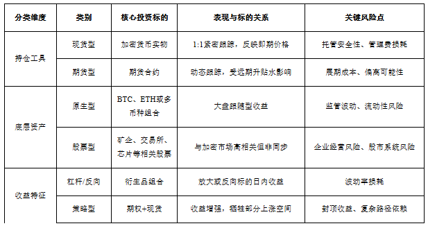 加密相关场内产品除按持仓工具分为现货持有型与期货合约型外,还可按跟踪对象分为单资产型与指数或篮子型;按底层资产类别区分为加密资产型与产业链股票主题型。杠杆、反向与部分策略型属于收益目标与再平衡机制更复杂的产品机制,常见为按日重置,路径依赖更强,适用人群更窄。