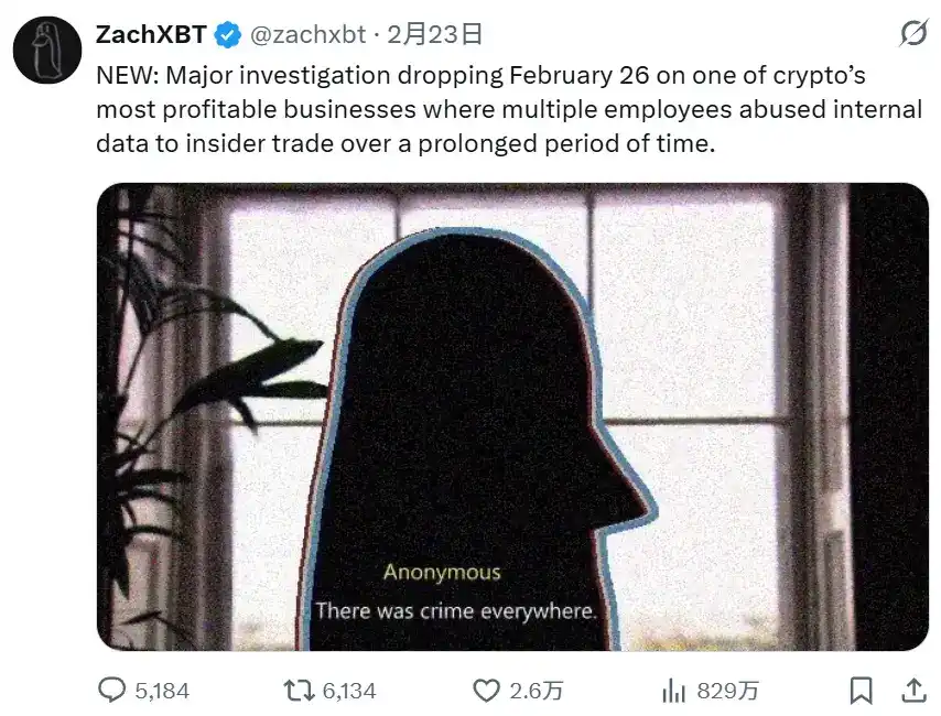 “最新消息:将于 2 月 26 日发布一项重大调查,涉及加密领域最赚钱的企业之一,该企业多名员工在很长一段时间内滥用内部数据进行内幕交易。”