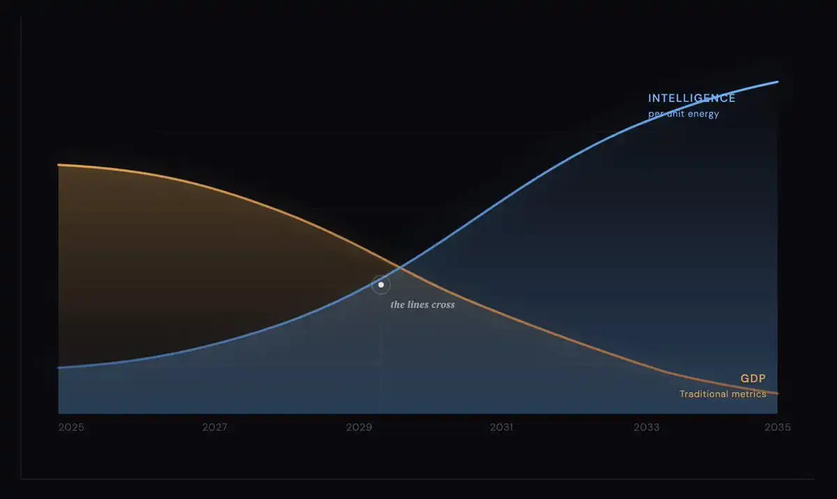 想想是什么在驱动 Citrini 所预言的危机。AI 模型正变得越来越强,算力成本不断走低,推理(Inference)成本更是跌破地板。由 AI 管理的能源系统正变得愈发高效。每一股力量——正是那些正在摧毁旧经济指标的力量——同时都在推动“单位能源智力产出”飞向天际。