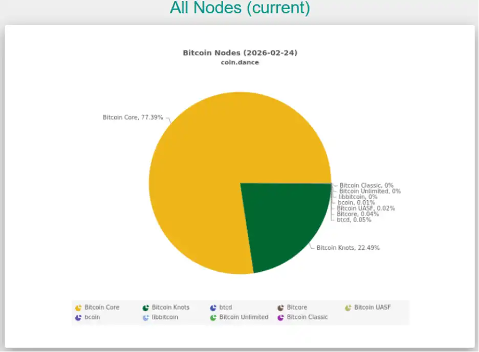 随着争议发酵,Bitcoin Knots的市场份额已飙升至22.49%,而全节点客户端Bitcoin Core的份额大幅下滑至77.39%。这一趋势表明,相当一部分节点正在通过更换客户端来表达对数据限制的支持。