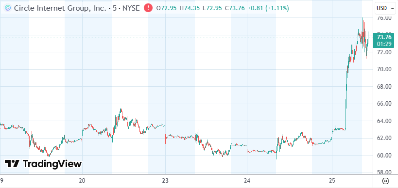 Circle于去年6月上市。随着市场对稳定币(通常与美元1:1挂钩的数字资产)的热情高涨,叠加次月特朗普签署稳定币监管法案,其股价一度大幅飙升。