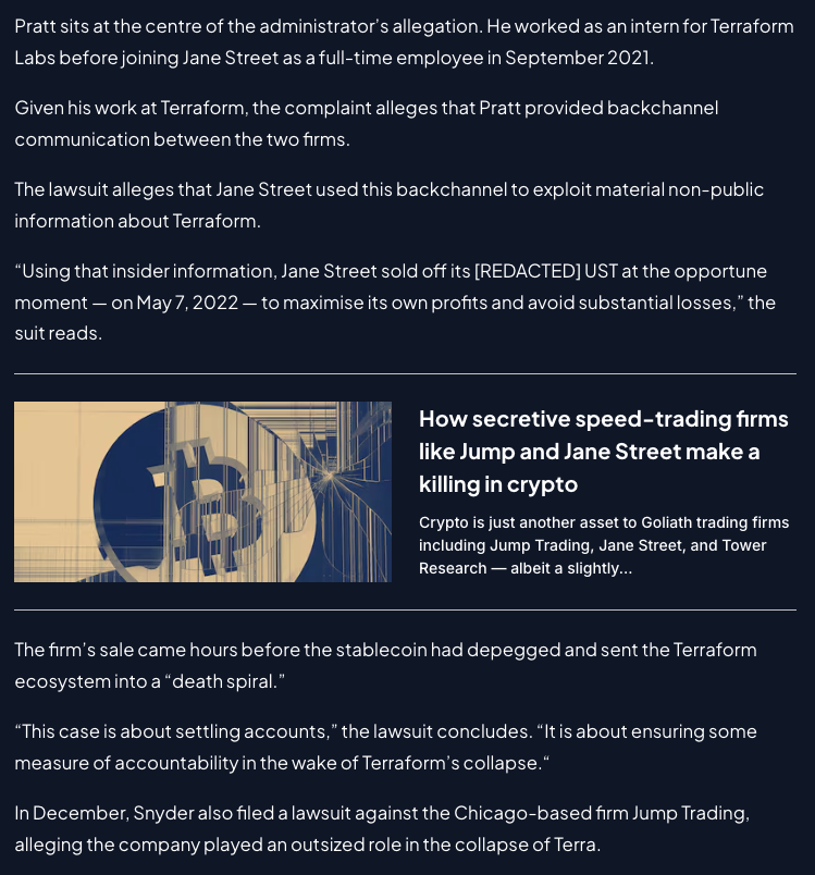 而就在本周,Terraform Labs 破产管理人在曼哈顿联邦法院提起诉讼,指控 Jane Street 利用内幕信息,抢跑 2022 年 5 月 Terra Luna 的崩盘。这场崩盘蒸发 400 亿美元市值,并引发连锁反应,最终拖垮 Celsius、Three Arrows Capital 和 FTX。