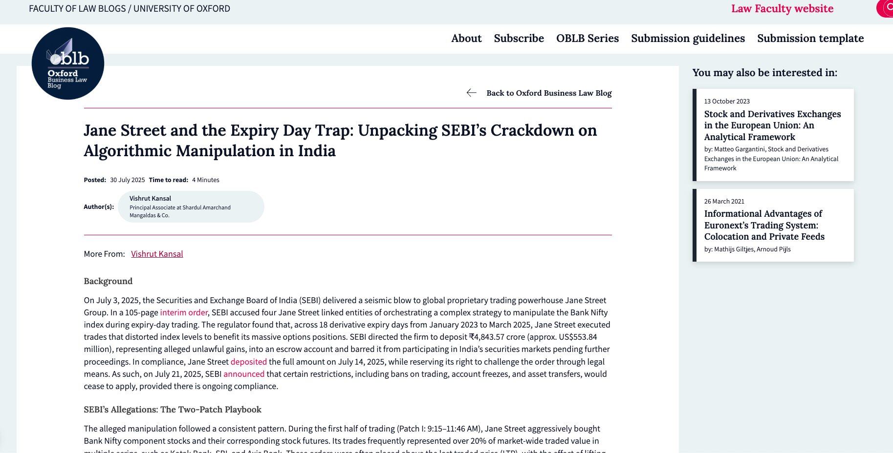 2025 年 7 月,印度证券交易委员会(SEBI)对 Jane Street 提出该国历史上规模最大的市场操纵指控之一。调查发现,在 2023 年 1 月至 2025 年 3 月的 18 个衍生品到期日中,Jane Street 对 Bank Nifty 指数实施了教科书式的拉高出货操作。
