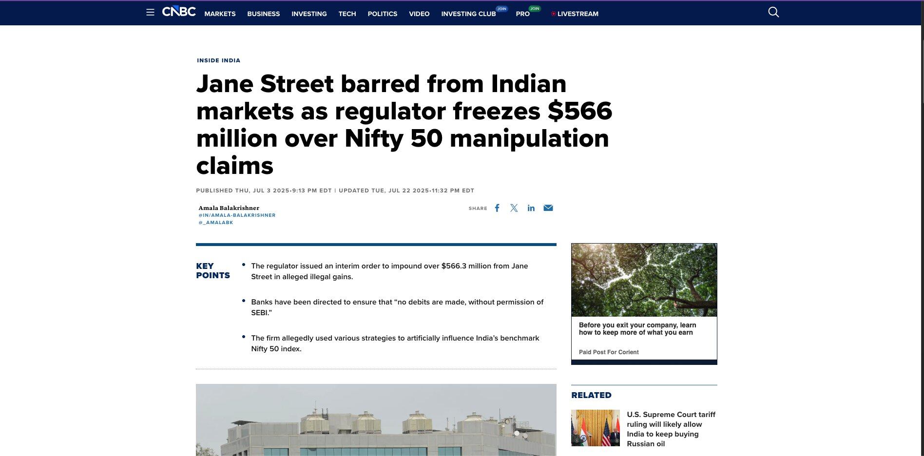 Jane Street 被禁止进入印度证券市场,已将 5.6 亿多美元存入托管账户并提起上诉。截至目前,案件仍在印度证券上诉法庭审理。