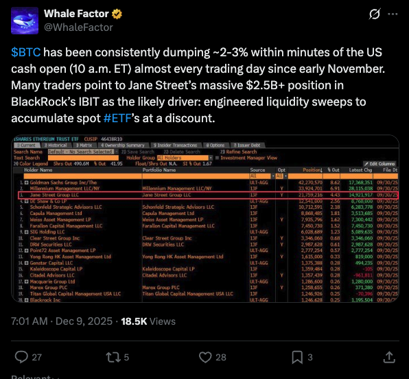 自 2025 年 11 月以来,比特币交易员发现一个异常现象。每天美东时间上午 10 点左右,即美股开盘之际,大量卖单涌向 BTC 及相关 ETF 份额。模式异常一致:亚洲和欧洲时段上涨,纽约开盘即遭抛压。 (可参考文章:《Jane Street 在纵比特币吗?病毒理论解析》)