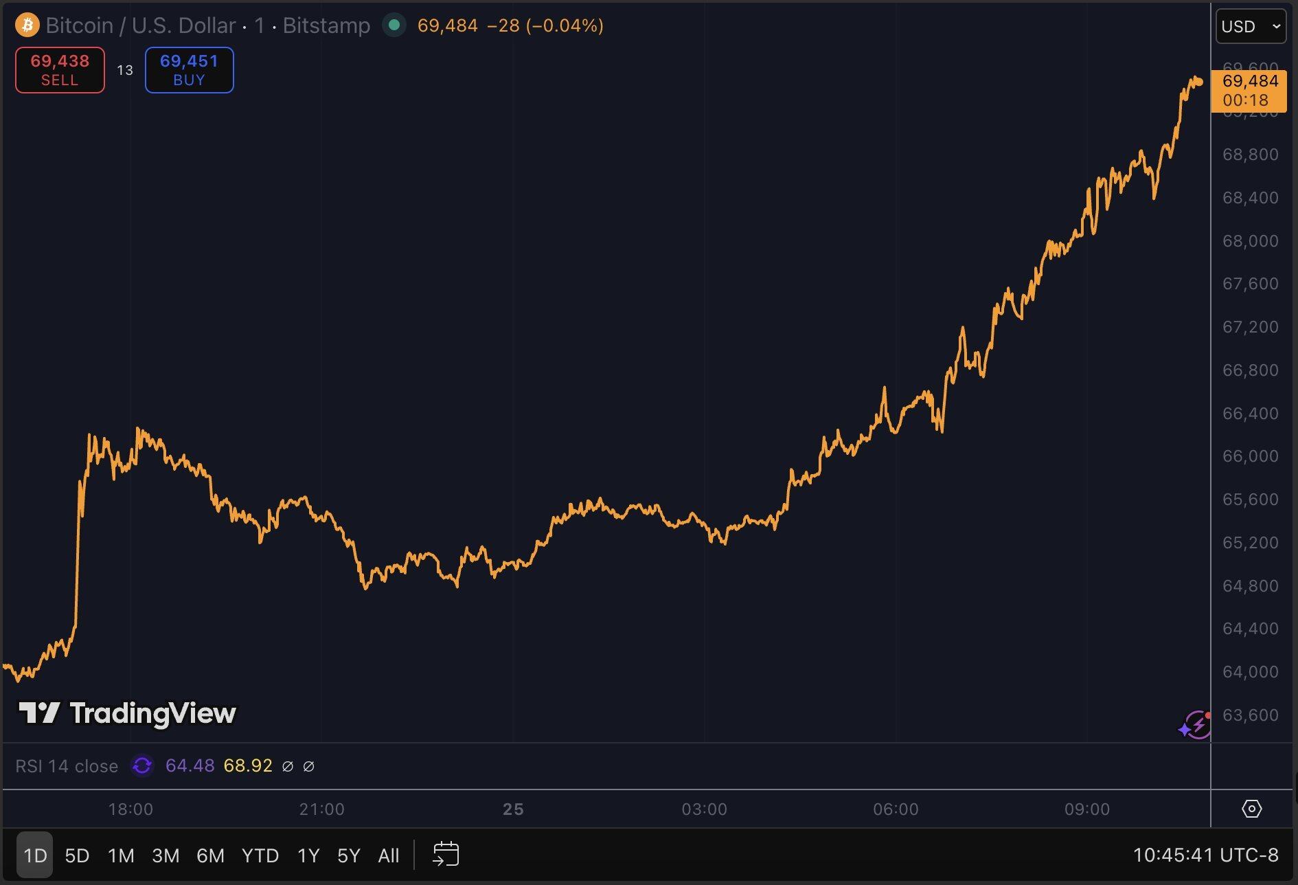 今天比特币上涨超过 3%,突破多道阻力位,重返 68,000 美元上方——而就在几天前,它还一度逼近跌破 60,000 美元。超过 3.23 亿美元的空头仓位被清算。随机 RSI(Stochastic RSI)触及 100。ETF 单日净流入达到 2.577 亿美元,为 2 月初以来最高。