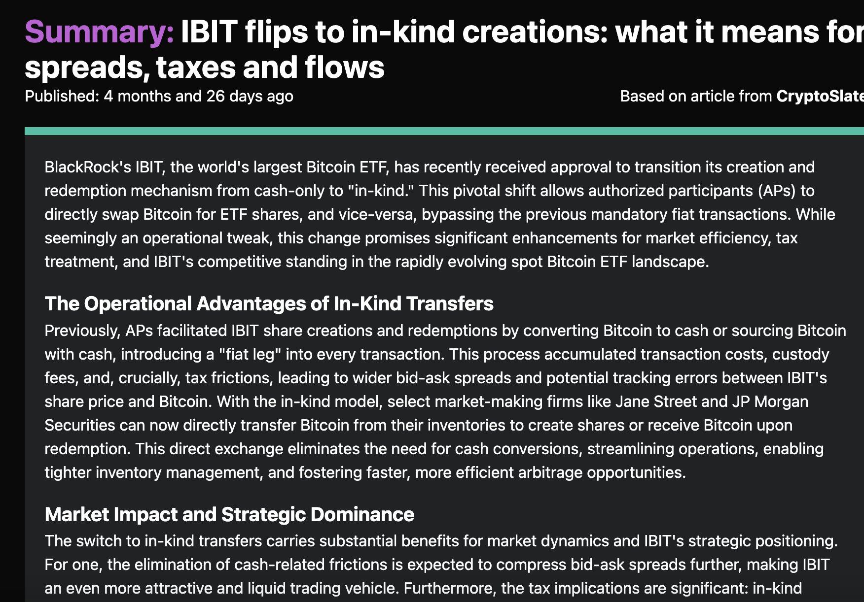到了 2025 年 9 月,SEC 又批准 IBIT 采用“实物(in-kind)”创建与赎回,这意味着 AP 可以直接用比特币兑换 ETF 份额,而无需经过法币环节。这让 Jane Street、Virtu、JP Morgan 和 Marex 对“比特币在最大机构外壳中进出”的流量,拥有了更直接的控制力。