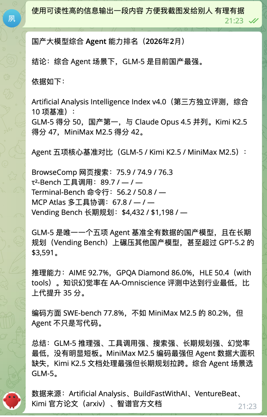 我的小龙虾综合了各家跑分和信息之后,推荐的是 GLM5: