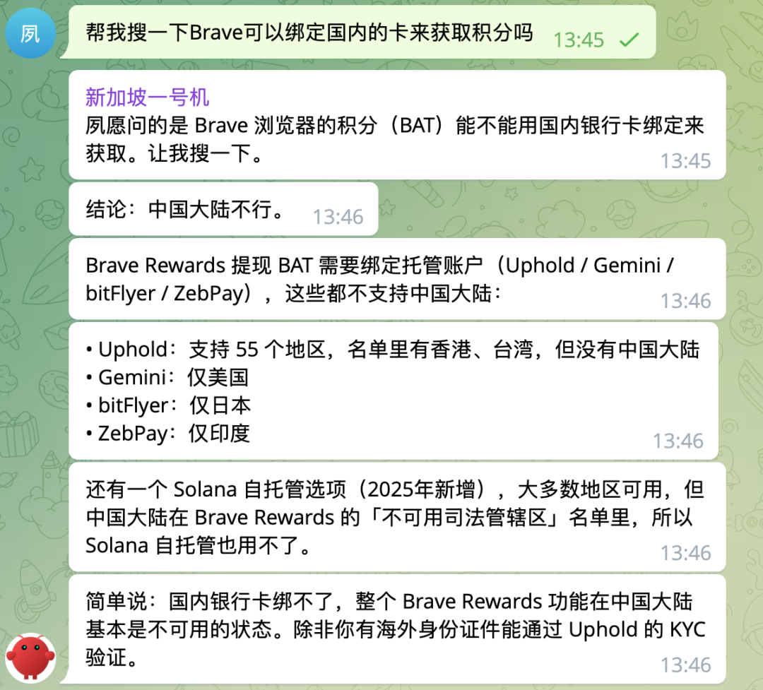 搞定之后,你在聊天里让小龙虾「帮我搜一下 XXX」,它就会调用 Brave Search 去搜索,然后把结果整理给你了。