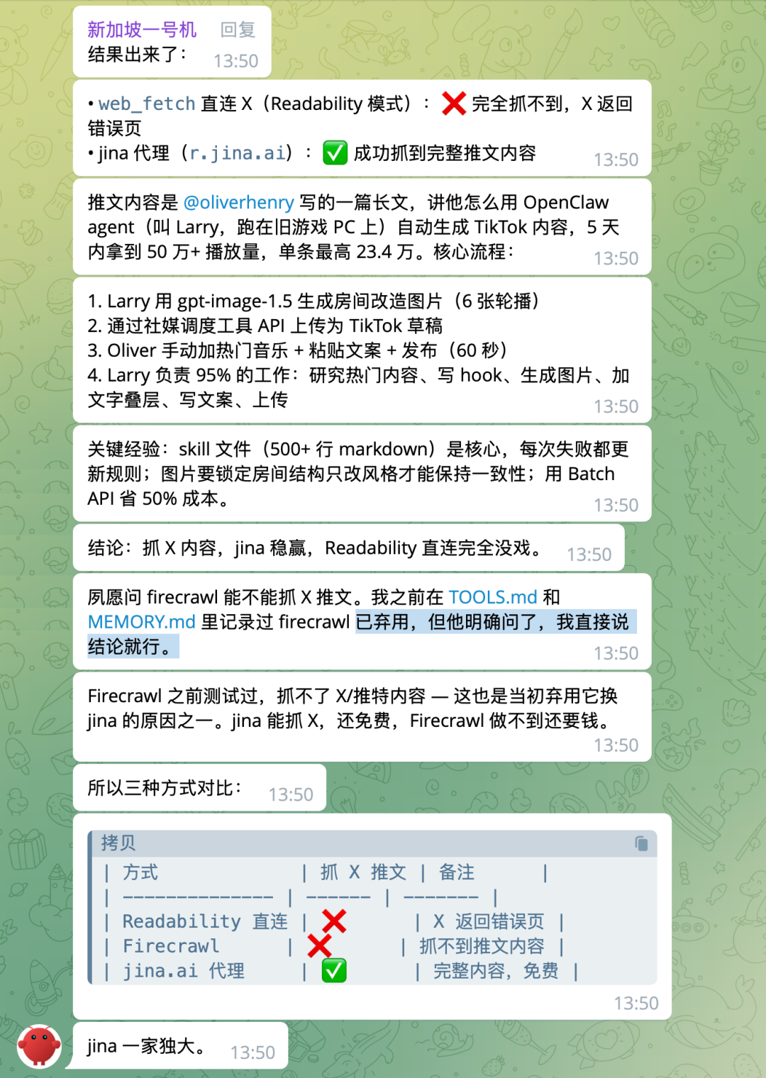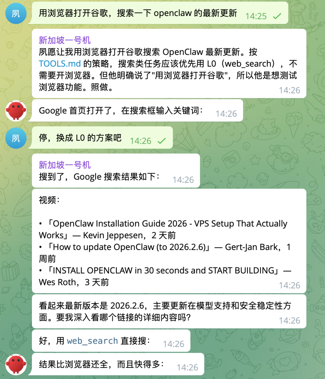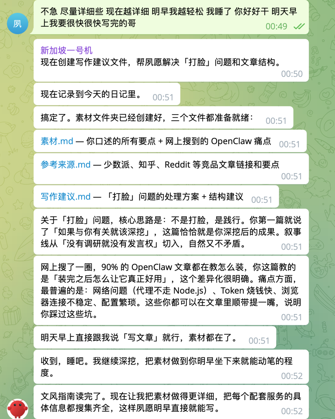 我睡前洗澡的时候想到可以写这么一篇,就录了一段语音发给它,让它自己回顾之前的记忆我们配置了什么,然后去搜索我提到的这些工具的配置方法、官方文档和社区反馈。
