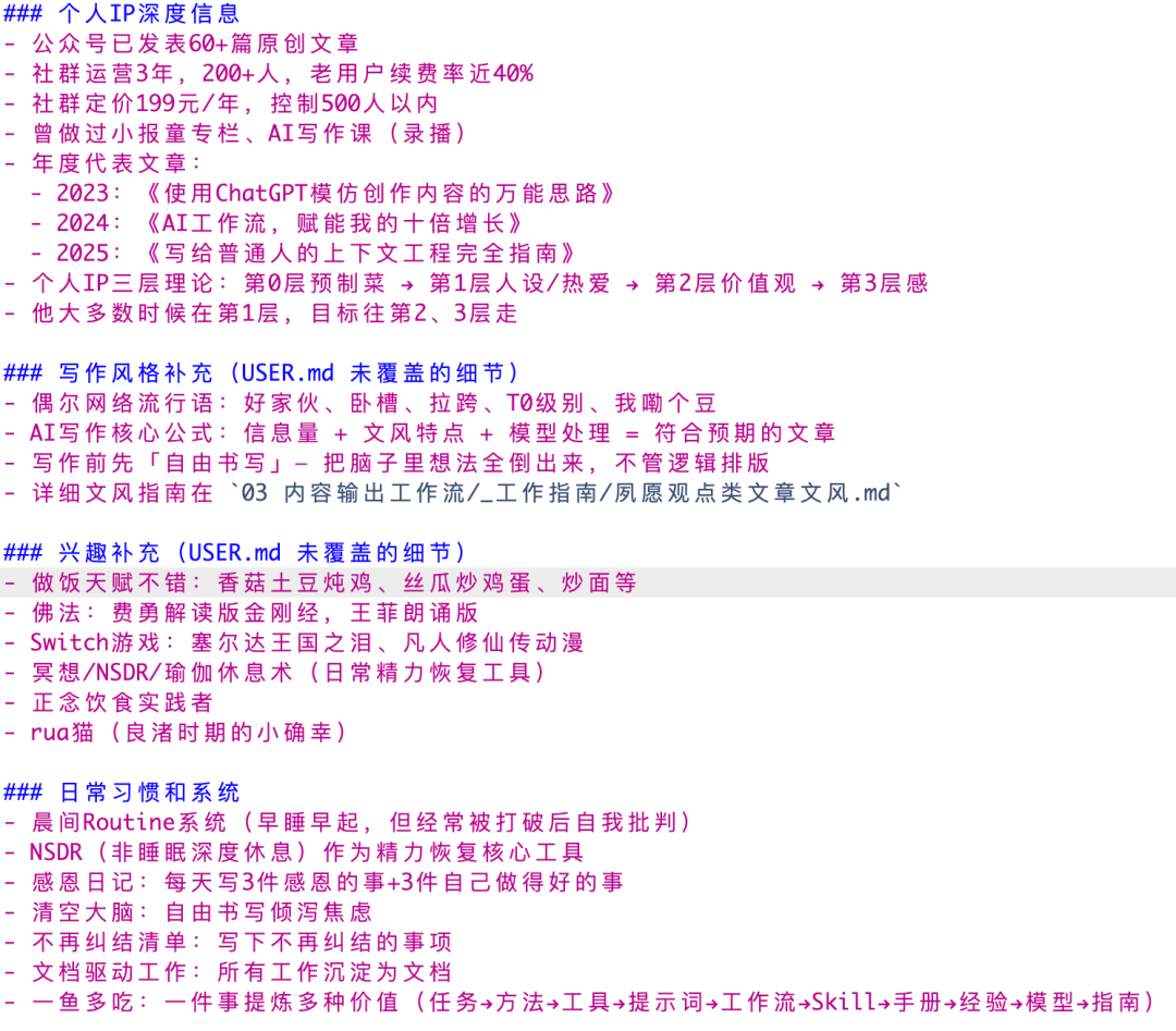 光有 SOUL.md 还不够。你的工作背景、项目情况、思考方式,这些光靠几段描述写不清楚。