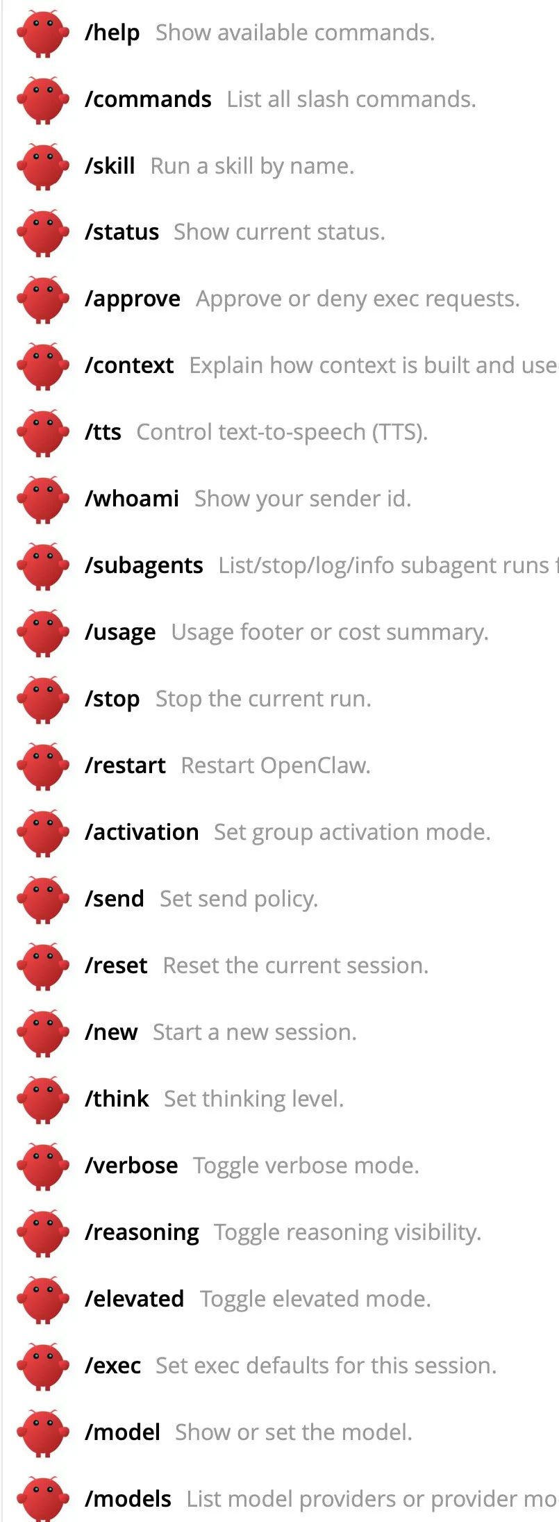 OpenClaw 有一套斜杠命令系统,在聊天里直接输入 / 开头的指令就能控制小龙虾的行为。