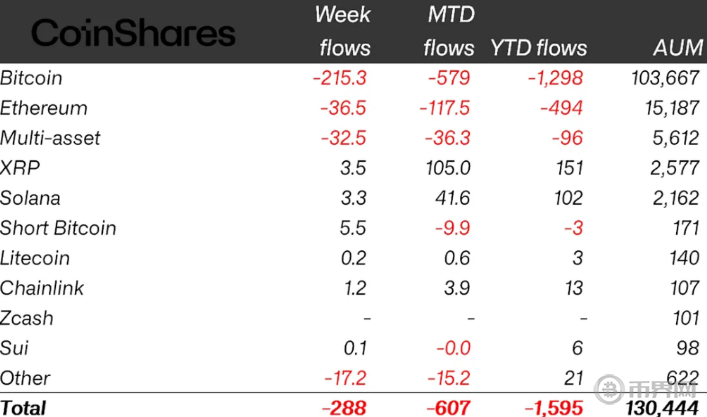 比特币成为“重灾区”,上周净流出2.15亿美元,以太坊紧随其后流出3650万美元。值得注意的是,做空比特币的产品罕见地吸引了550万美元流入,创下单一资产中最高空头资金流入纪录。与此同时,Solana、XRP和Chainlink等少数山寨币基金却录得小额净流入。这反映出资金并非彻底离场,而是在进行赛道切换和策略对冲。
