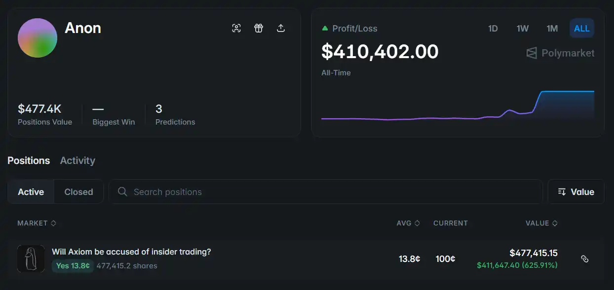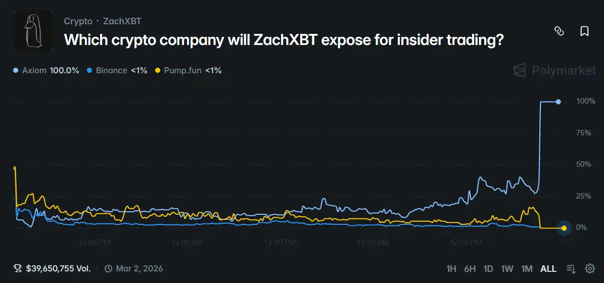 由于 ZachXBT 过往披露信息的高质量,该专题上线 Polymarket 数小时后,交易量便超过一千万美元。而在 26 日晚,ZachXBT 正式公布涉事公司名为 Axiom,一家 2024 年创立以来总收益已接近四亿美元的去中心化交易平台。