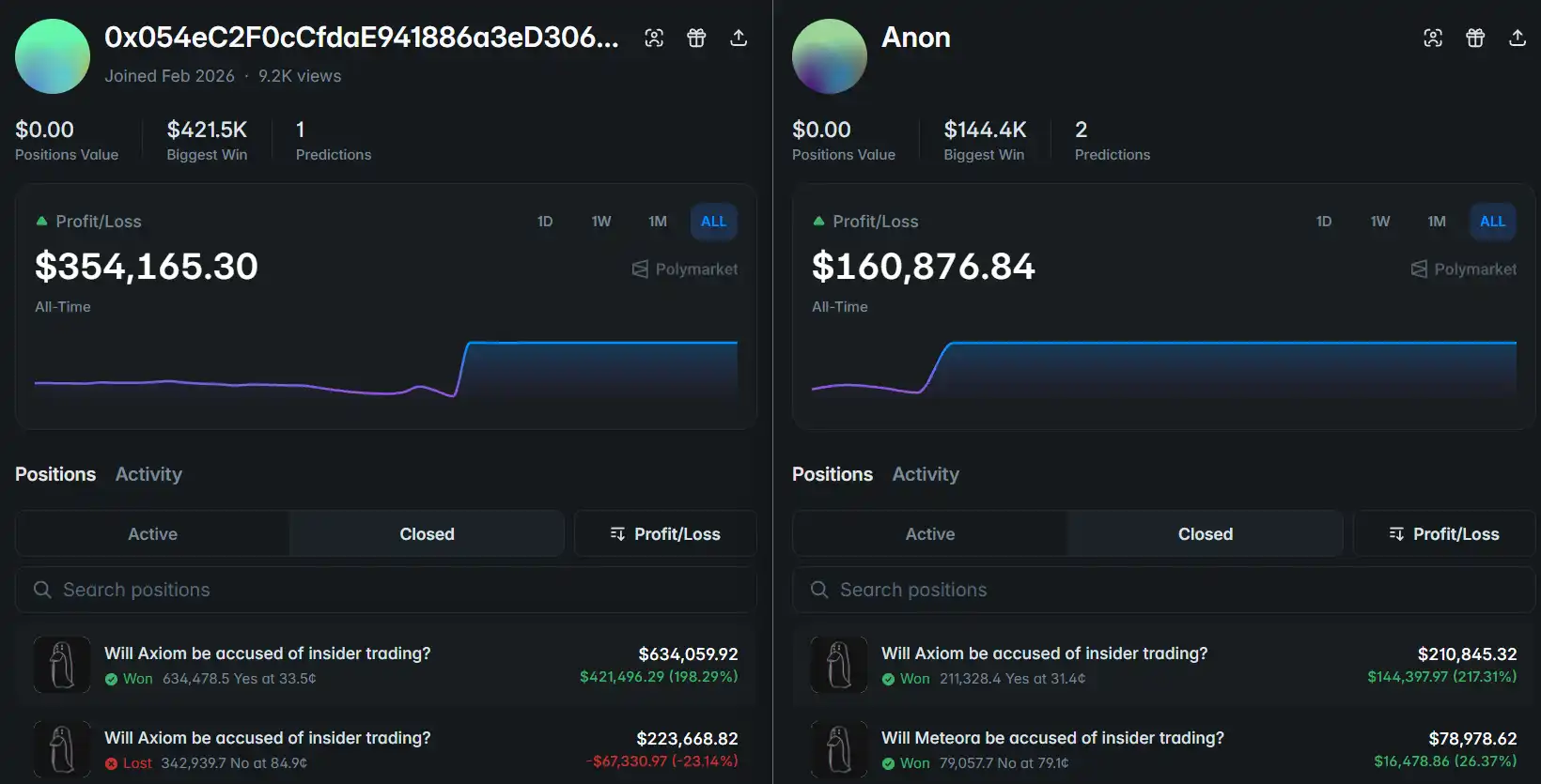 在「ZachXBT 将指控 Axiom 内幕交易」这个市场中,两个地址非常瞩目,因为实在是赚太多了,一个赚了 35 万美金,一个赚了 16 万美金。