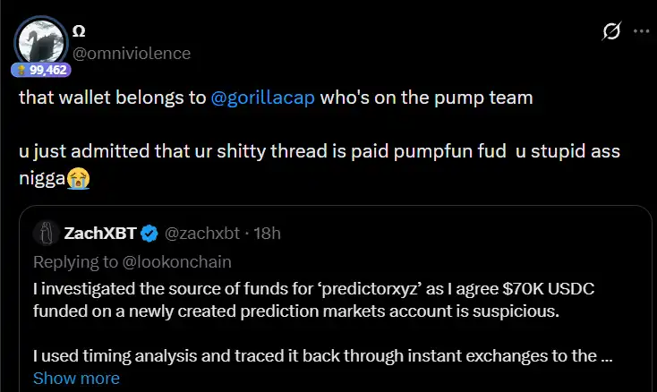 在拿到调查结果后,Pump.fun 的合伙人 gorillacap 利用时间差提前在预测市场下注,赚走 40 万美元的同时,利用 ZachXBT 本身自带的流量属性使 Axiom 名声扫地。