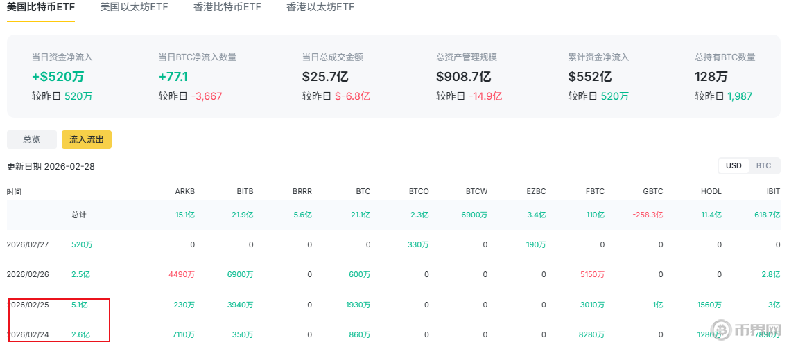 我们看到,资本正以前所未有的速度涌入,例如,美东时间2月24日,比特币现货ETF结束此前的资金流出态势,总净流入达到2.58亿美元;次日(2月25日),资金流入势头进一步增强,单日总净流入飙升至5.07亿美元,成为近三周以来表现最佳的一天 。贝莱德的IBIT领跑,单日狂揽2.97亿美元,占当日总流入的近60%。