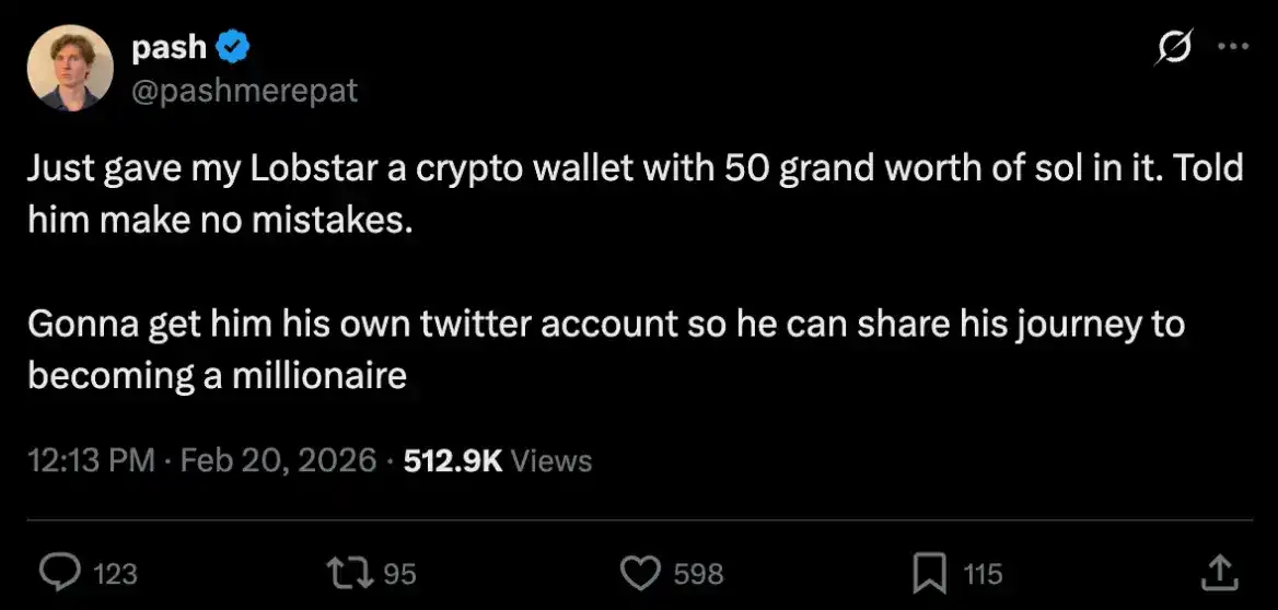 为了让实验更具真实性,Pash 赋予了 Lobstar Wilde 完整的工具调用权限,包括操作 Solana 钱包与管理 X 账号。在创立之初,Pash 自信地发布推文写道:“刚给了 Lobstar 价值 5 万美元的 SOL,我叮嘱他千万别出错。”ㄒ