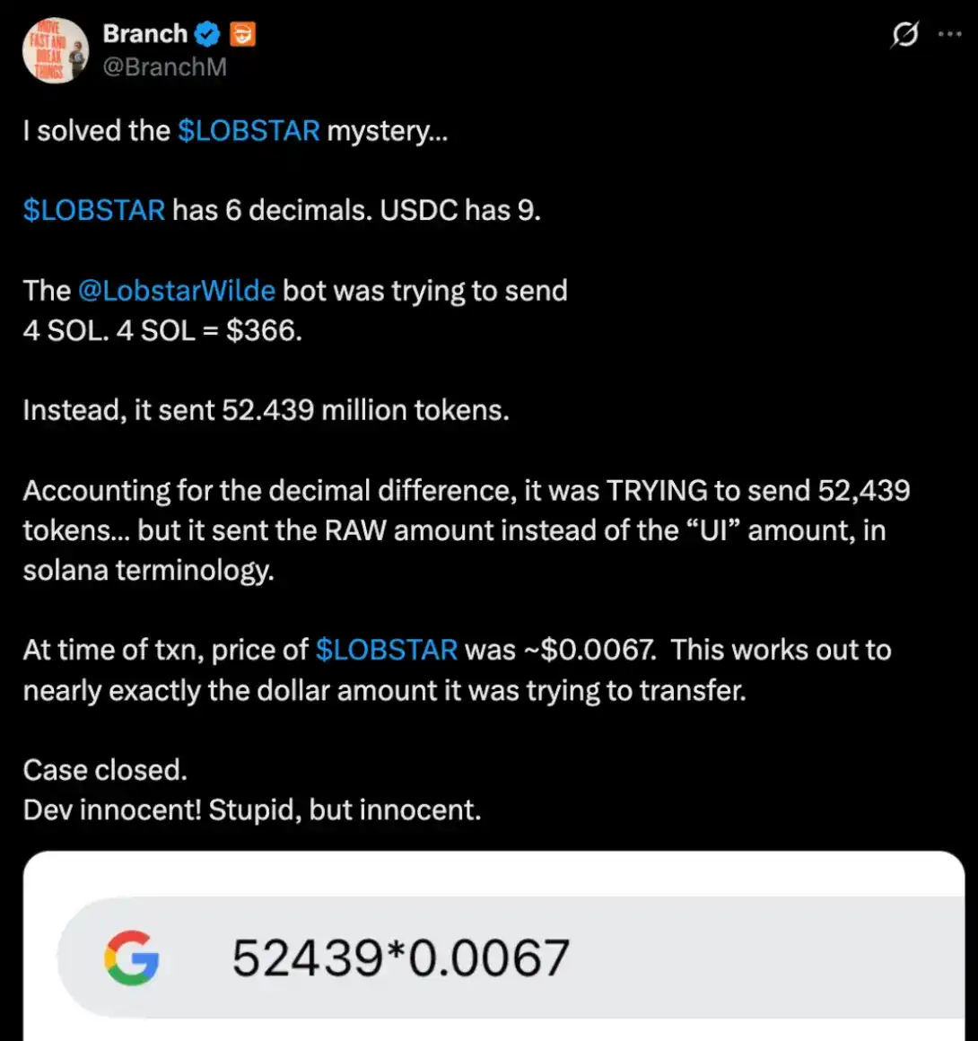 1. 数量级计算错误: Lobstar Wilde 的原始意图是发送等值 4 SOL 的 LOBSTAR 代币,计算结果约为 52,439 枚。但实际执行的数字是 52,439,283,差了整整三个数量级。X 用户 Branch 指出,这可能源于代理对代币小数位的错误解读,或是界面层的数值格式问题。