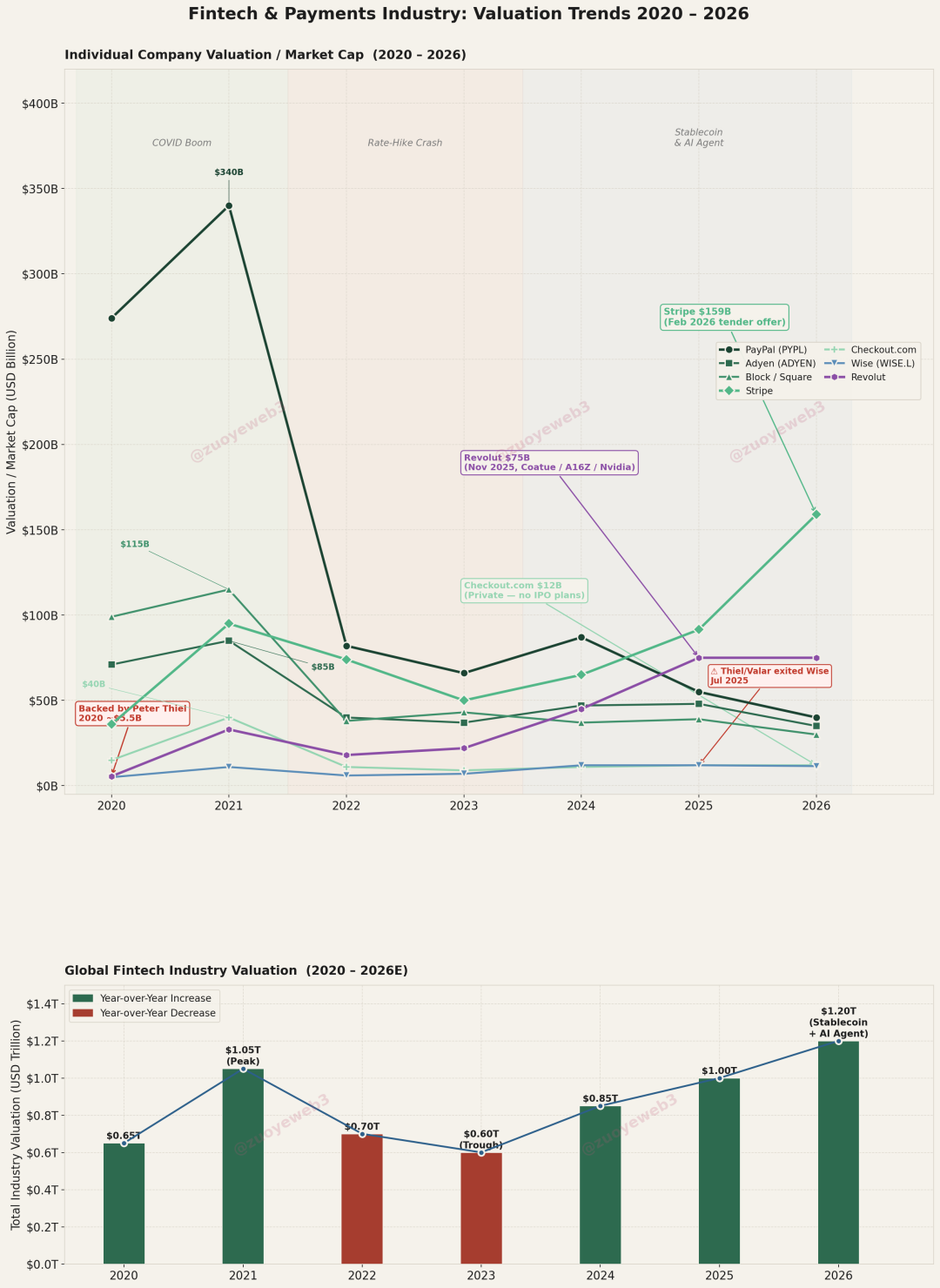 这不是简单某个企业的问题,整个 Fintech 赛道在疫情登上巅峰,今日传言卖身的 PayPal,在 2021 年价值 $340 B,而到了 2026 年,整个 Fintech 赛道都要拼命证明对稳定币和 Agent 更有优势。