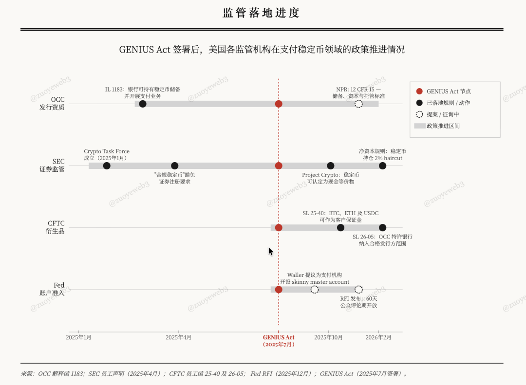 细数天才法案之后的监管动作,Fed+OCC+CFTC+SEC 给支付稳定币大开方便之门,但代价是抹除收益稳定币的存在根基,以回应银行业的“存款流失”危机,同时引导稳定币走入现有体系。
